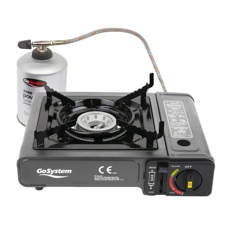The GoSystem Dynasty II Multi-Fuel Portable Stove is a tough, compact single-burner cooker designed for camping, festivals, fishing trips, and emergency use. Unlike standard stoves that only take one type of cartridge, this is a multi-fuel stove — meaning it can run on BOTH the standard clip-in butane cans and external threaded gas canisters via the hose adapter. So if one type of fuel is sold out, you’re still cooking.